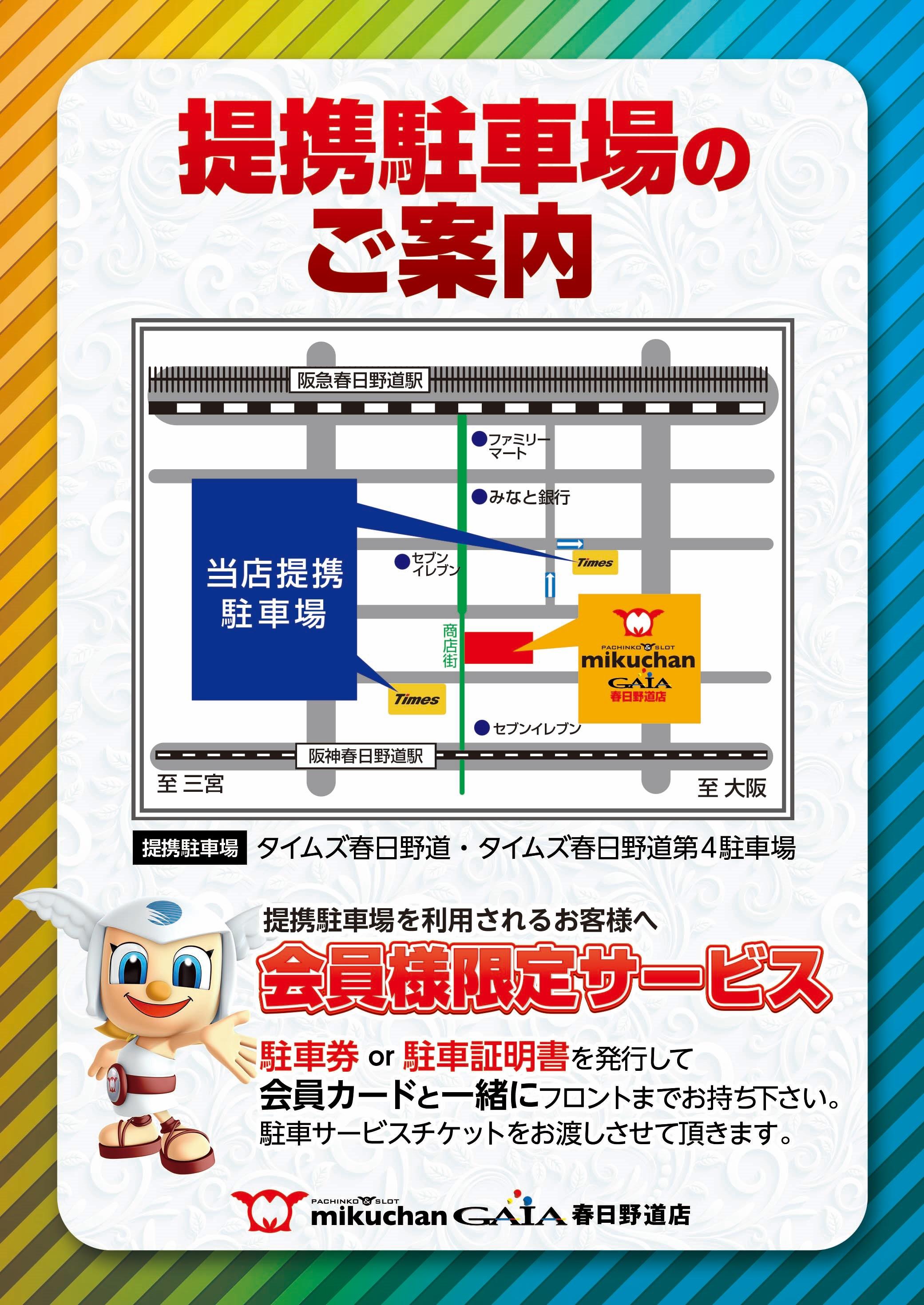 | 特徴 | ■会員システム 来店ポイントを貯めてお得商品をGET! 会員限定ポイント商品など、特典いろいろ♪ 提携駐車場もアリマス♪ ■出玉の移動・共有OK 玉・コインともに移動・共有することが出来ます。 御夫婦、カップル、お友達でお楽しみください。 ■提携駐車場サービス お車でご来店の方も安心してご遊戯いただけます。 阪急春日野道駅降りてすぐのタイムズに約20台 ミクちゃんガイア春日野道店降りてすぐのタイムズに約32台 ミクちゃんガイア春日野道店正面入口前のタイムズに3台完備! |