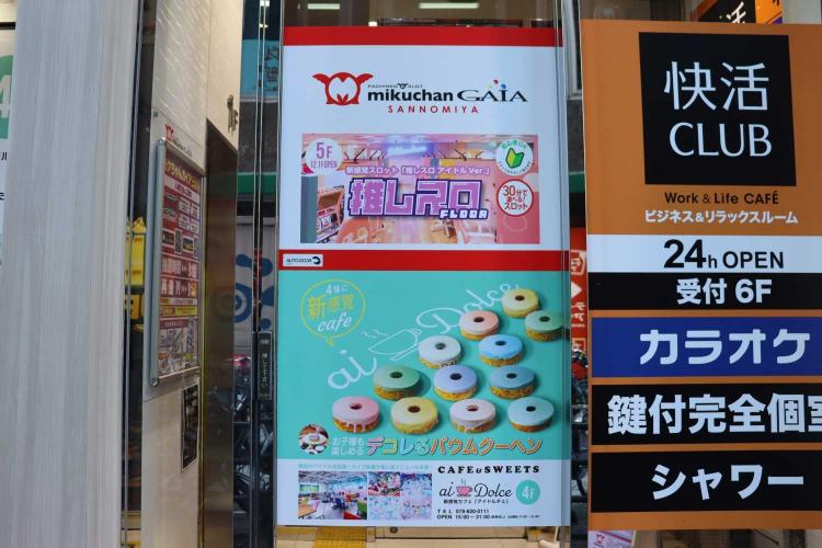 ▲三ノ宮駅から歩いてすぐ、推しスロの看板が目に入る