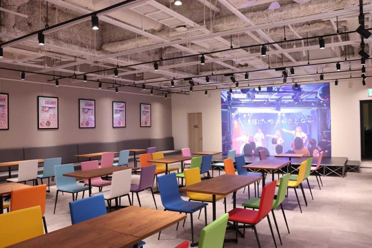 店内は清潔感のある佇まいで、座席数も豊富に用意されています。そしてフロア奥にはステージと巨大スクリーンが設置されており、PV放映やライブも楽しめるように設計されています。