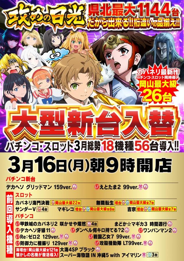 | 特徴 | ◆日本初防災特化型店舗 ◆完全コロナ対策 ◆岡山最大1144台 だから出来る 設置機種ラインナップ ◆広々とした楽々台間スペース ◆パチンコ・スロット 全台拡大計数機設置 ◆完全除菌・消臭ルーム ◆休憩ルーム コミック岡山最大数4000冊以上、 全席USBポート完備 ◆Wi₋fi完備 ◆VIP喫煙ルーム ◆マッサージコーナー ◆喫茶コーナー |