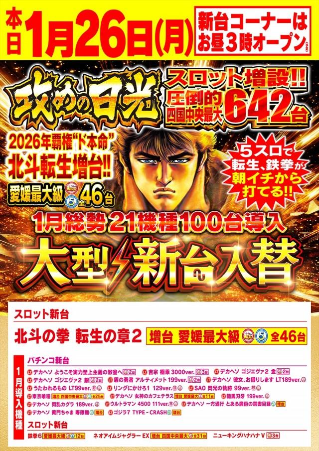 | 特徴 | ★四国中央最大1015台 だからできる 設置機種ラインナップ ★パチンコ・スロット 全台拡大計数設置 ★完全除菌・消臭ルーム ★休憩ルーム コミック3000冊、 全席USBポート完備 ★wi-fi完備 ★マッサージコーナー 女性専用あり ★飲食コーナー |