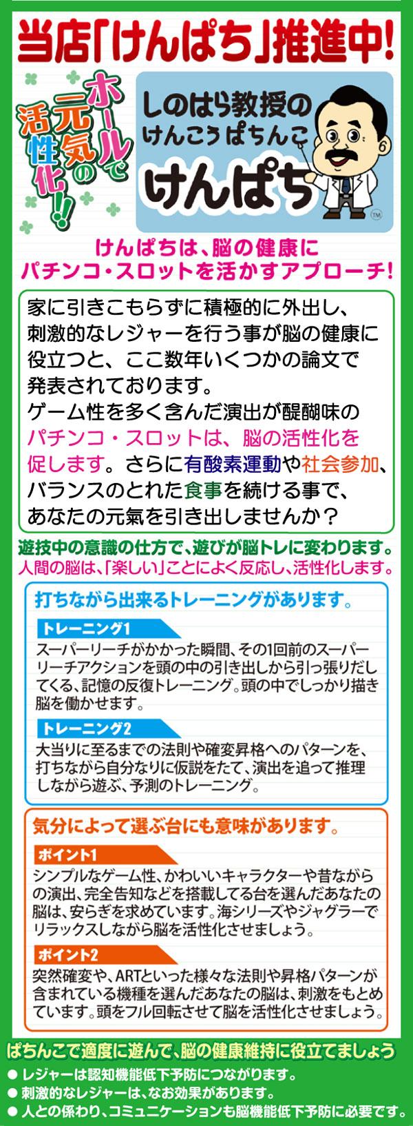 | 特徴 | 地下スロット、全60台の5円スロットフロアが完成!! パチンコ 247台 / スロット 110台 100円24玉/100円96玉パチンコ 20円/5円スロット設置店!! 「ご覧いただき誠にありがとうございます。地域の皆様に末永く愛される店づくりを目指して参りますので、今後とも宜しくお願い申し上げます。お気づきの点がございましたらスタッフに一言頂くかご意見ボックスをご利用くださいませ。」 |