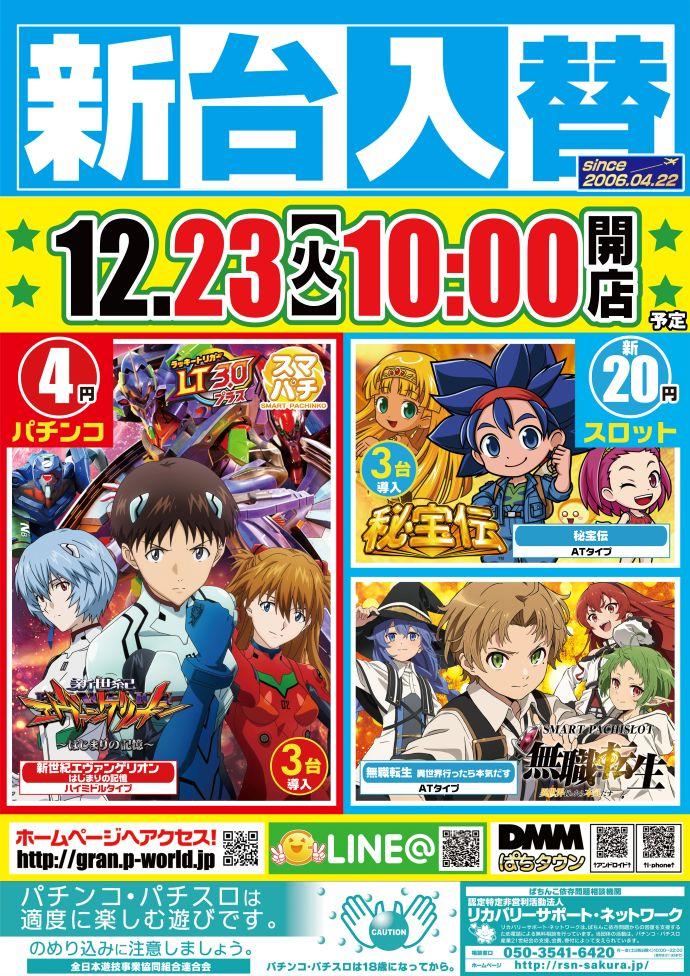 - 12月23日(火) ★新台入替★エヴァンゲリオン17、秘宝伝、無職転生!