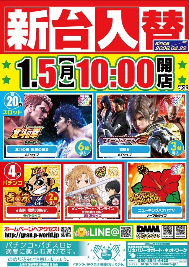 - 1月5日(月) ☆新台入替☆L北斗転生2・L鉄拳6・e吉宗・他新台多数導入!!