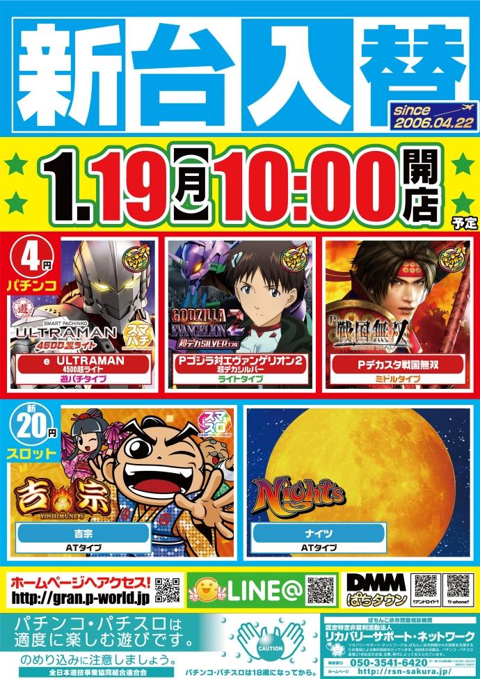 - 1月19日(月) ★新台入替★eULTRA・Pゴジエヴァ2・P戦国無双・L吉宗・Sナイツ導入!!