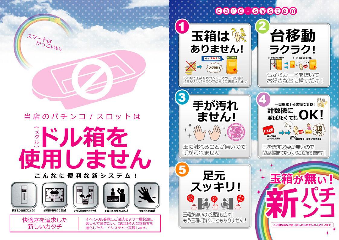 | 特徴 | 地域初!選べる4貸玉 パチンコ専門店。 全台各台計数機導入でご遊技らくらく♪ |