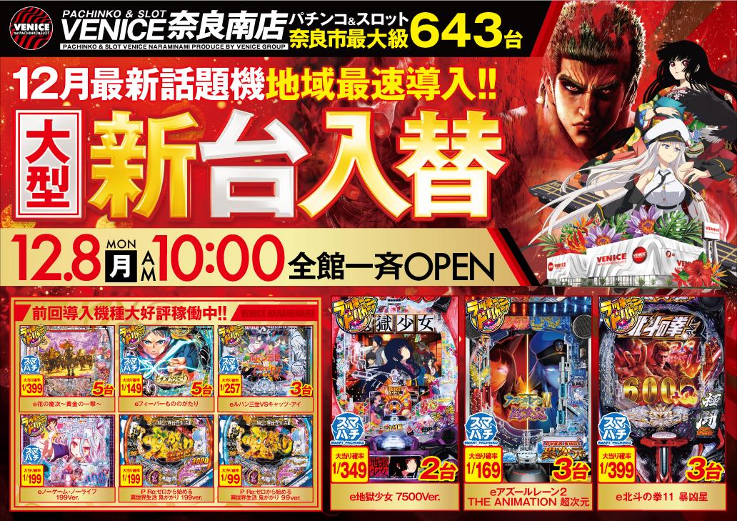 | 特徴 | 奈良市最大級!関西エリアに21店舗展開中のベニスグループ 奈良エリア最新店舗! 最新台&話題機最速大量導入!! |