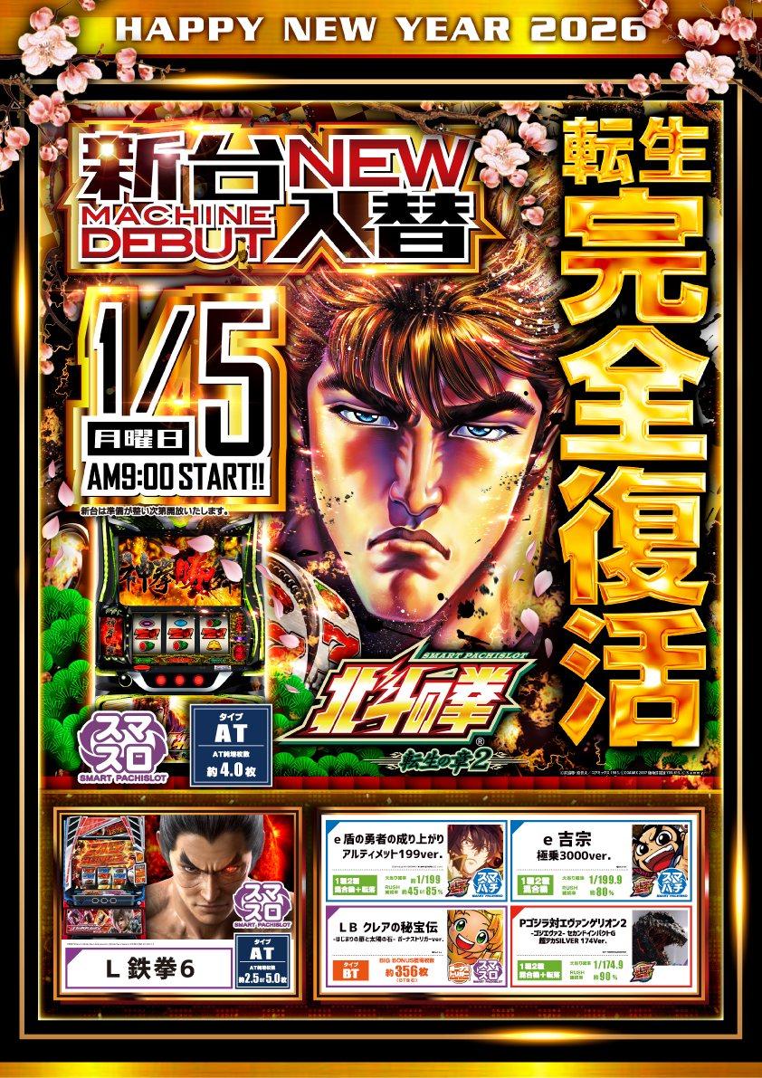 - 1/5(月)[新台入替] L北斗の拳-転生の章2-など導入!!