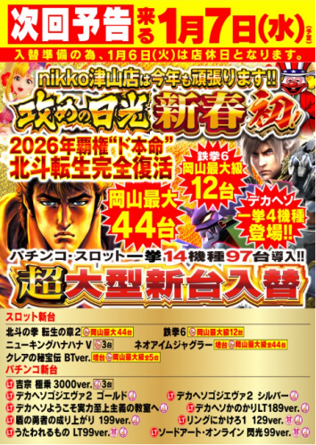店舗 店舗情報トップ 本日の打ちいこ情報 取材 スケジュール レポート ホール取材 機種 機種情報トップ 新台カレンダー 設定判別ツール 演出信頼度まとめ 新台レポート コンテンツ コンテンツトップ 特集記事 マンガ 動画 お知らせ コミュニティログイン ログイン/会員登録 自由帳 マイページ パチポイント スロッコ パチセブントップ 本日の打ちいこ情報 打ちいこ検索結果(フリーワード) 打ちいこ情報 打ちいこ検索結果 検索結果 (全 216 件) 34567 2026.01.12 ビックつばめ高崎店 群馬県 高崎市 2026.01.09 まるみつ霧島店 鹿児島県 霧島市 2026.01.08 ビックつばめ高崎店 群馬県 高崎市 2026.01.07 グラッセ 茨城県 日立市 2026.01.07 ベニス守口店 大阪府 守口市 2026.01.07 nikko高松中央店 香川県 高松市 2026.01.07 アミューズ富田林 大阪府 富田林市 2026.01.07 アミューズ吹田岸辺 大阪府 吹田市 2026.01.07 MEGAコンコルド1020刈谷知立店 愛知県 知立市 2026.01.07 nikko大分中央店 大分県 大分市 2026.01.07 nikko屋島店 香川県 高松市 2026.01.07 ライブガーデン幸手権現堂店 埼玉県 2026.01.07 nikko津山店 岡山県 津山市 2026.01.07 第一プラザ船橋店 千葉県 船橋市 2026.01.08 ゴルフ3 大阪府 羽曳野市 2026.01.31 ベガビック1200安曇野店 長野県 34567 その他から探す ホール名・住所から探す その他から探す 都道府県から探す 会員登録済みの方はこちらから パスワードを忘れた方はこちら パチスロ新台情報 パチンコ新台情報