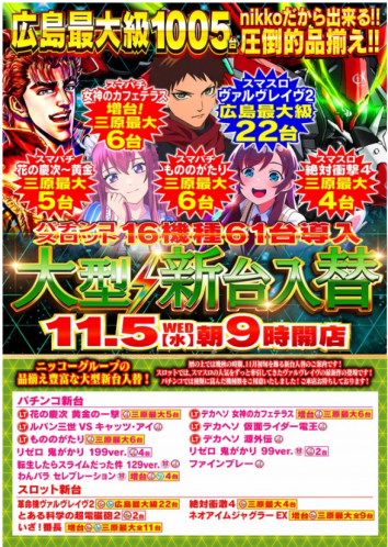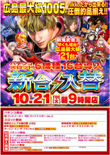 店舗 店舗情報トップ 本日の打ちいこ情報 取材 スケジュール レポート ホール取材 機種 機種情報トップ 新台カレンダー 設定判別ツール 演出信頼度まとめ 新台レポート コンテンツ コンテンツトップ 特集記事 マンガ 動画 お知らせ コミュニティログイン ログイン/会員登録 自由帳 マイページ パチポイント スロッコ パチセブントップ 本日の打ちいこ情報 チラシ検索(都道府県から探す) 広島県 打ちいこ情報 ALL 本日 明日 昨日 広島県 市区町村 広島市中区(0) 広島市東区(0) 広島市南区(0) 広島市西区(2) 広島市安佐南区(1) 広島市安佐北区(0) 広島市安芸区(0) 広島市佐伯区(0) 呉市(0) 竹原市(0) 三原市(2) 尾道市(0) 福山市(0) 府中市(0) 三次市(0) 庄原市(0) 大竹市(0) 東広島市(0) 廿日市市(0) 安芸高田市(0) 江田島市(0) 安芸郡府中町(0) 安芸郡海田町(0) 安芸郡熊野町(0) 安芸郡坂町(0) 山県郡安芸太田町(0) 山県郡北広島町(0) 豊田郡大崎上島町(0) 世羅郡世羅町(0) 神石郡神石高原町(0) 検索結果 (全 5 件) 2025.11.07 テキサス中筋 広島県 広島市安佐南区 2025.11.05 nikko1000+LM 広島県 三原市 2025.11.05 nikko1500広島店 広島県 広島市西区 2025.10.21 nikko1500広島店 広島県 広島市西区 2025.10.21 nikko1000+LM 広島県 三原市 その他から探す ホール名・住所から探す その他から探す 都道府県から探す 会員登録済みの方はこちらから パスワードを忘れた方はこちら パチスロ新台情報 パチンコ新台情報