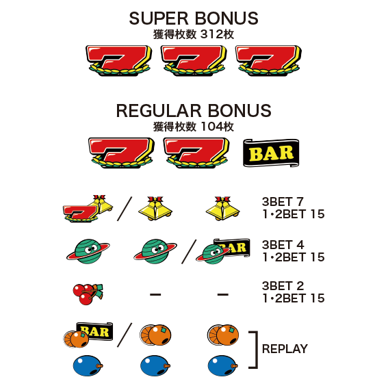 ★SUPER BONUSは獲得枚数312枚、REGULAR BONUSは獲得枚数104枚のノーマルタイプ。