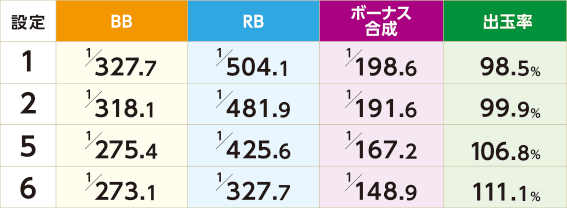 | 設定 | ルート⑦ | 設定示唆 トータル 出現率 |