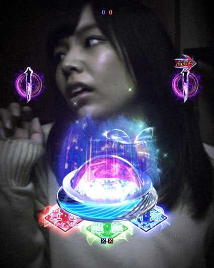 貞子の手役物を右手で握ると液晶内のエフェクトの色が変化。最終的にボタンPUSHで手役物が落下すれば大当りだ!