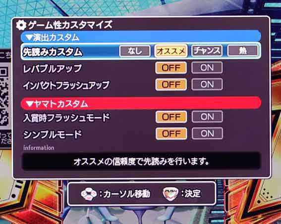 変動停止中にPUSHボタン押下、または変動中に十字キーの上下ボタンを押すことでカスタムモードの選択・変更ができる。