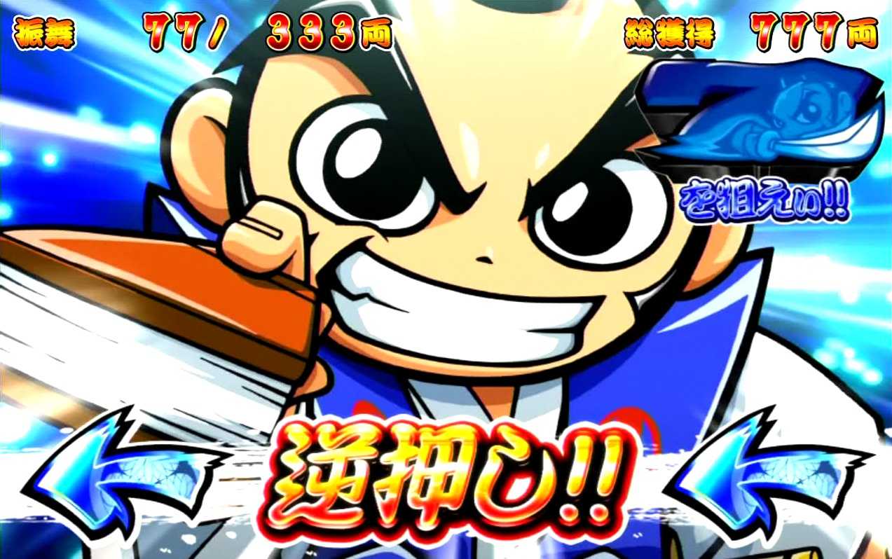 レア小役で突入抽選。家紋高確率中は10Gの間に1/3.8の家紋リプレイを揃えられれば解除確定。10Gを超えても家紋リプレイの押し順をミスするまでは継続する。保留玉のヒキと家紋リプレイのヒキの波長を合わせる事に集中だ! 超家紋高確率も同様の仕様だが、解除期待度が高くなっている。