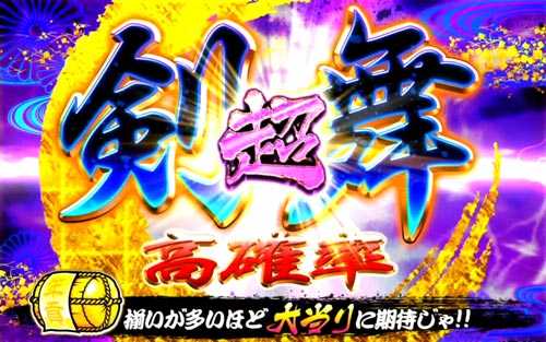 剣舞高確率は俵リプレイの連続で突入のチャンス。連続すればするほど突入の期待度はアップし、4連で突入確定となる。10G間の剣舞高確率中は俵揃いとレア役でモードアップ抽選を行なっており、メーターが赤までいけば解除に期待できる。超剣舞高確率も同様の仕様だが、解除期待度が高くなっている。