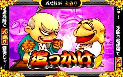 通常高確率経由の連続演出は「悪者成敗」、「追っかけ」、「百人斬り」、「メカ代官」の4種。基本的には百人斬りとメカ代官発展を祈りたいが、悪者成敗で宙太、追っかけで天守閣などそれぞれアツイパターンが用意されている。