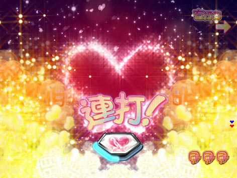 液晶上部のハピベルギミックと、液晶左の愛込めベルギミックが同時に揺れれば期待度大幅アップ。変動中やリーチ後に発生する可能性あり。