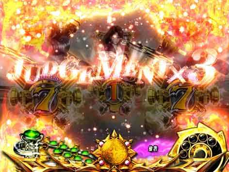 ジャッジメント図柄停止からはじまる擬似連続予告。3連以上に発展すれば期待できる。