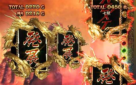 | 仕様 | ・黄龍図柄揃いのたびにG数上乗せ ・保証G数は3〜49G。 以降は黄龍図柄ハズレ時に50%で継続。 |