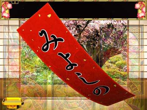変動開始時に短冊が舞う先読み演出。赤短はチャンス(あかよろし<みよしの)、唐草模様の短冊は激アツ!