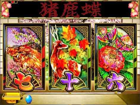 停止図柄で「三光」「月見で一杯」「猪鹿蝶」などの“花札の役”ができていれば次変動が超激アツ!! 変動停止時にボタンを押すと役名を表示できる。