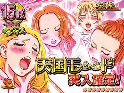 右打ち消化の電サポモード(確変)。突入率5%とそう簡単には突入しないが、一度入ってしまえば継続率78%で一撃の連チャンに期待が持てる。メガボーナス中(16R)の「ピカイチ昇天アタック」で昇天に成功すれば天国モード突入だ。