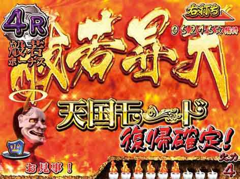 天国モード中の四図柄で発生する4R大当り。天国モード中は般若ボーナスのみ天国モード終了の可能性があるため当たるとピンチ……。ラウンド中の「般若討伐チャレンジ」成功で天国モード継続、失敗した場合はラウンド終了後に通常時へ移行する。