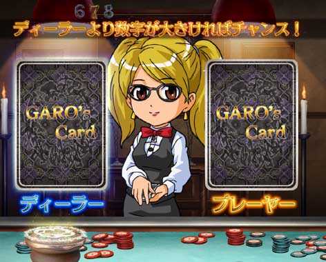 「GARO BONUS」の画面表示時に「SUPER GARO BONUS」の文字が落ちてくれば保留内連チャン濃厚! ラウンド中は専用映像が流れる。