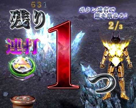 ボタン押しで金図柄が出現すればGARO BONUSに昇格!! ボタン表示が大きければ昇格期待度がアップする。また、金キバが登場することも!?