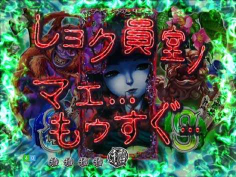 青&緑図柄揃いの4R大当り。基本的に大当り後は「丑三つモード」突入となるが、「怪談ナイトモード」へ突入することも!!