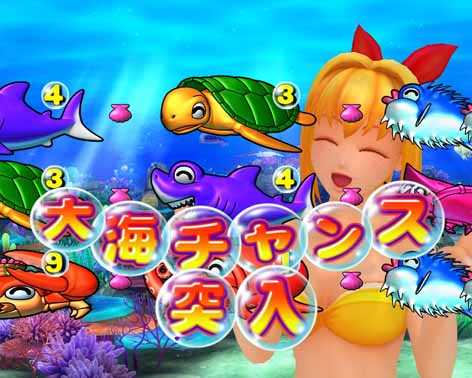 通常変動やリーチで図柄が止まらないと、「3・4・1」の図柄が停止し2R確変の「大海チャンス」に突入。