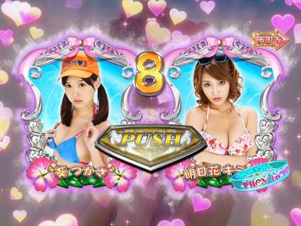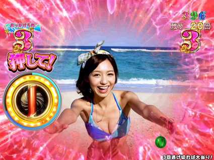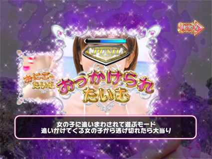 総勢20名のセクシー女優が画面からあふれ出す、多彩で魅力的なアクションが本機最大の特徴。初回突入率60%、電サポ中突入率100%のV確変STタイプ(ST100回)で、選べる2つのRUSHを搭載。草食系の『おっかけられたいむ』と肉食系の『おにごっこたいむ』のどちらかを選択してプレイすることができる。