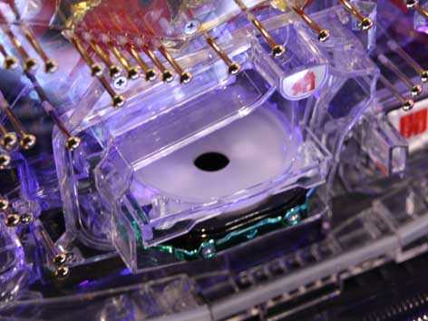 「沼パチンコ予告」で玉がチューリップを通過すると、クルーン役モノ内に玉が出現! 玉が穴に入った時の発光色で期待度が変化する。