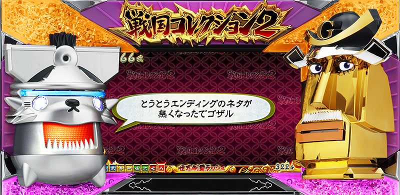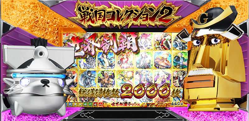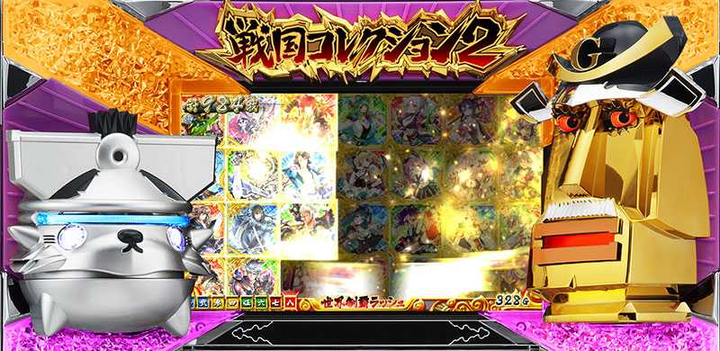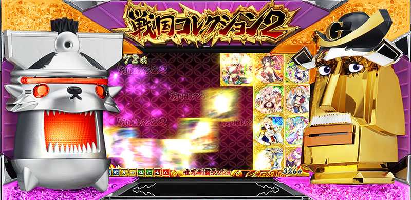 パチスロ「戦国コレクション2」は5号機最高峰のAT純増2.999枚×直乗せ最大300Gというハイスペック機として長期間ホールの稼働に貢献した「戦国コレクション」の2作目。前作よりAT純増枚数も3.0枚ジャストとパワーアップし、同社が「激闘!西遊記」から採用している〝アクセルAT〟も搭載。従来のAT機のようにリプレイや1枚役が頻出することなく、ベルで7枚、スイカで12枚の払い出しを行うというノーマル機に近い感覚で楽しめるAT機となっている。