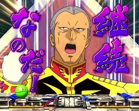 旧ザクに乗るガデムがシャアに補給を届けるジオン軍モード専用リーチ。「VS」などの特殊図柄停止による強スーパー発展に期待したい!