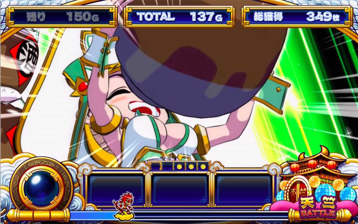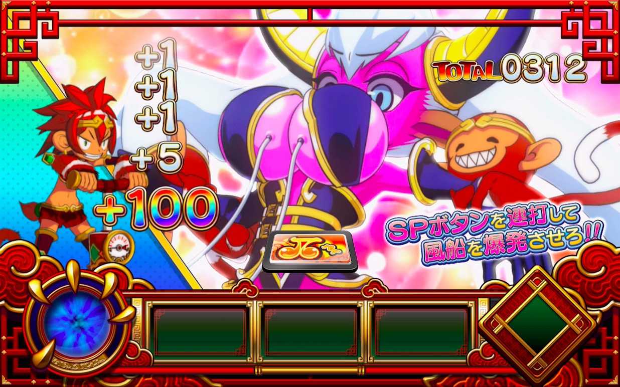 | 仕様 | ・天竺王の掌から脱出orかわすことができればAT継続 ・継続の場合30〜100GのG数上乗せ ・失敗しても復活抽選がある模様 |