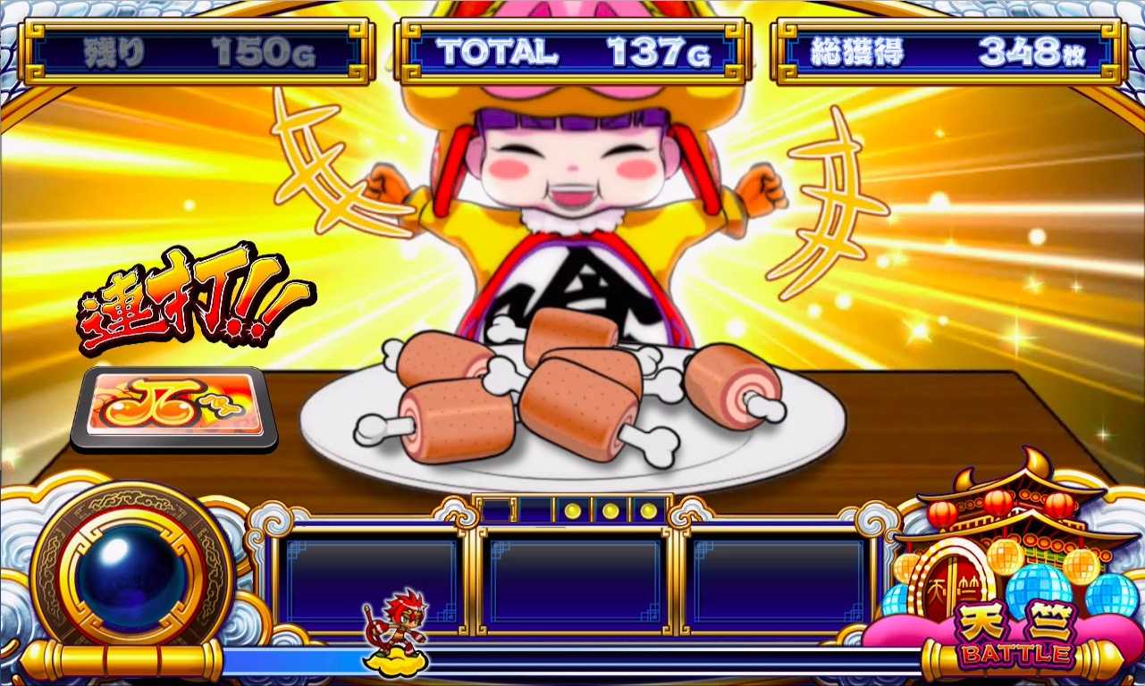 | 継続率 | 初期 5or50% 「天竺バトル」勝利でMAX85%までランクアップする可能性あり 継続率80%以上の場合、花吹雪が舞う「天竺RUSH」に突入!? |