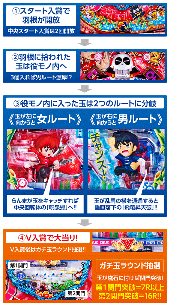 役モノ内に入った玉が右へ進めば「男(乱馬)ルート」。玉が乱馬ギミックの横を抜ければスペシャルルートの「飛竜昇天破」で、役モノ最上部から垂直落下でV入賞を狙う。また、スペシャルルートへ進まなくても、玉が乱馬ギミックにキックされればV入賞のチャンスだ!