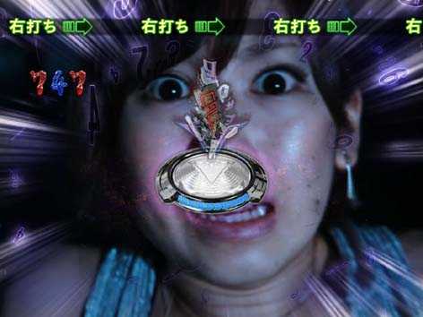 突如現れる恐怖のキャラ!! 写真の不気味なキャラ(マリエ!?)は、変動中やリーチ中などにチャンスアップ演出として登場する模様。登場すればアツいのでうれしいですが、急に現れるのでめちゃめちゃびっくりします! |