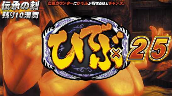 「伝承の刻」は20G継続の自力チャンスゾーン。20G間は毎ゲーム「ひでぶ」の獲得抽選を行なっていて、獲得したひでぶ数がそのままAT当選期待度に!最終ゲームでバトル演出に発展し、見事勝利できればAT当選!100ひでぶなら…!?