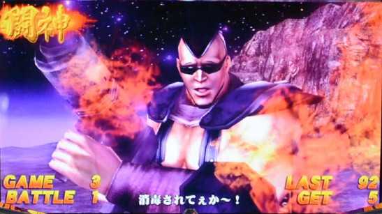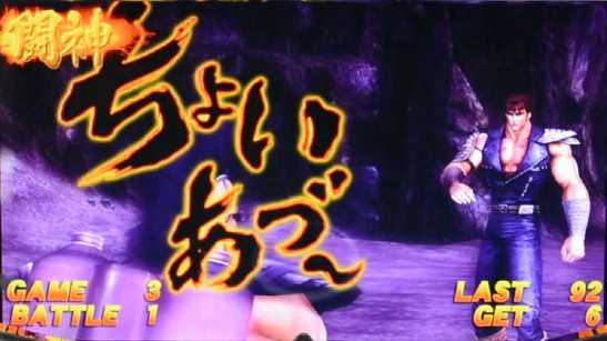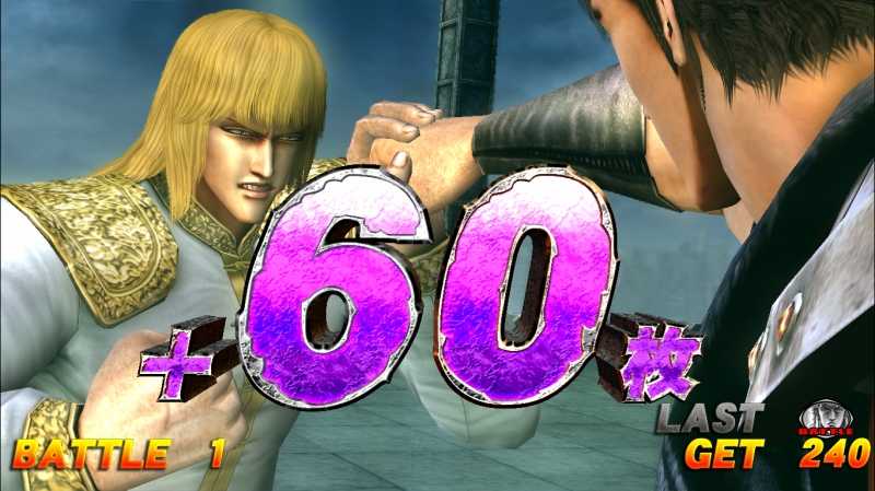 残り枚数表示がゼロになったら継続バトルに突入。今作の継続バトルは突入した時の滞在ステージによって登場キャラが異なり、継続濃厚の闘神ではトキVSラオウのバトルが見られるぞ!