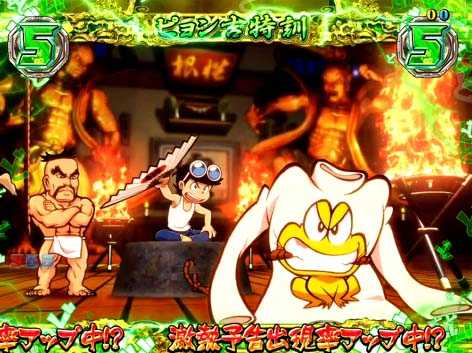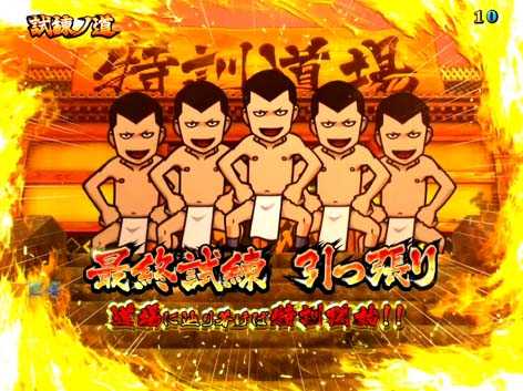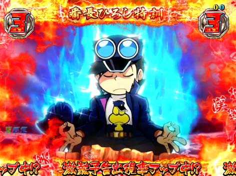 パチスロでおなじみの「特訓」は、リーチ後の連続演出として発生。激アツ演出の発生率がアップするなど、大当りに繋がる重要な演出となっている。特訓は継続するほどアツいが、さらに継続時に昇格すればチャンス。ひろし特訓<ピョン吉特訓<番長ひろし特訓の順に期待度がアップする。また、突入した時点で激アツの「猛特訓」も存在!!