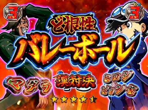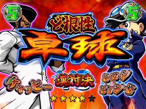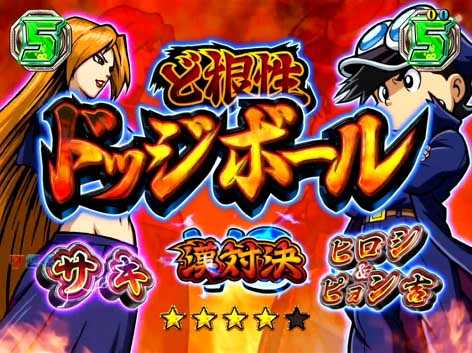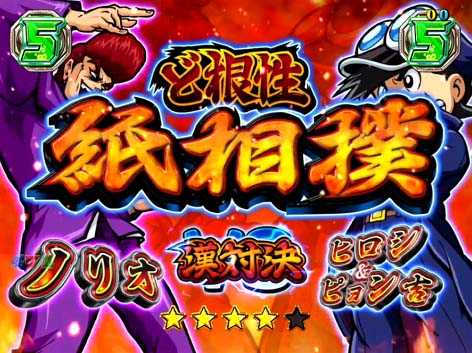 ひろし&ピョン吉がライバル番長たちと対決するリーチで、対決キャラや対決種目によって期待度が変化。パチスロと同様に各キャラには苦手な種目があり、「ノリオの紙相撲」や「サキのドッジボール」などの“漢対決(タイトルに出現)”へ発展すれば期待できる。漢対決は他の対決から発展することもあるぞ!