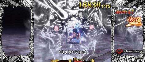 図柄揃いの初当りはオーガBONUSで、ラウンド中に刃牙VSオーガのバトル演出が発生。刃牙がオーガの攻撃に耐えきれば4R大当り+独闘RUSH突入で、倒れてしまった場合は16大当り+樹海モード突入。もっともうれしいのは復活パターンで、樹海モード突入画面で「最強」可動体が落下すれば、16R大当り+独闘RUSH突入となる。