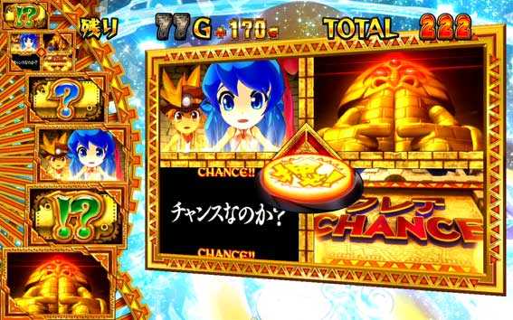 上乗せ特化ゾーン「秘宝RUSH HYPER」へは、主に秘宝RUSH中のチャンス目から突入。3種類+αの上乗せ演出が存在し、上乗せ期待度は秘宝スプRUSH<クレアチャレンジ<PYRAMID POWERの順にアップする。