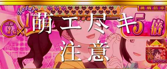 毎ゲーム配当や倍率の上乗せ抽選を行う上乗せ特化ゾーンで、ゲーム性はパチスロ化物語の倍倍チャンスとほぼ同じ。液晶で「萌エ尽キ注意」と表示されるとゾーン終了のピンチで、終了すると配当×倍率の「語」が上乗せされるぞ。消化中は、液晶右の先読み小窓の最上段に表示される内容で演出が変化する。