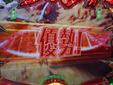 「突破」図柄が停止するメインの連続予告。3連続発展でチャンス!