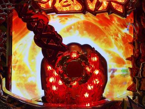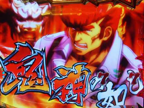 変動中の鬼神登場から突入する高期待度ゾーン。画面左右のオビの色が赤になれば期待度アップ!?