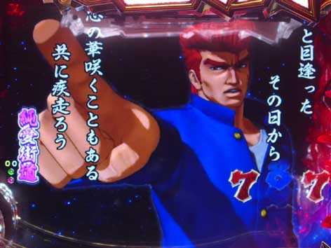 3・7以外の数字図柄揃いや、天下無敵図柄停止は「男ボーナス」。ラウンド中に発生するブンブンルーレットに成功すればST「狂乱麗舞」へ突入、失敗した場合は時短「カッ飛び!!ゾーン」へ突入する。ブンブンルーレット成功後に鬼浜インパクトが炸裂すれば15Rの友情挽歌ボーナスへ昇格。